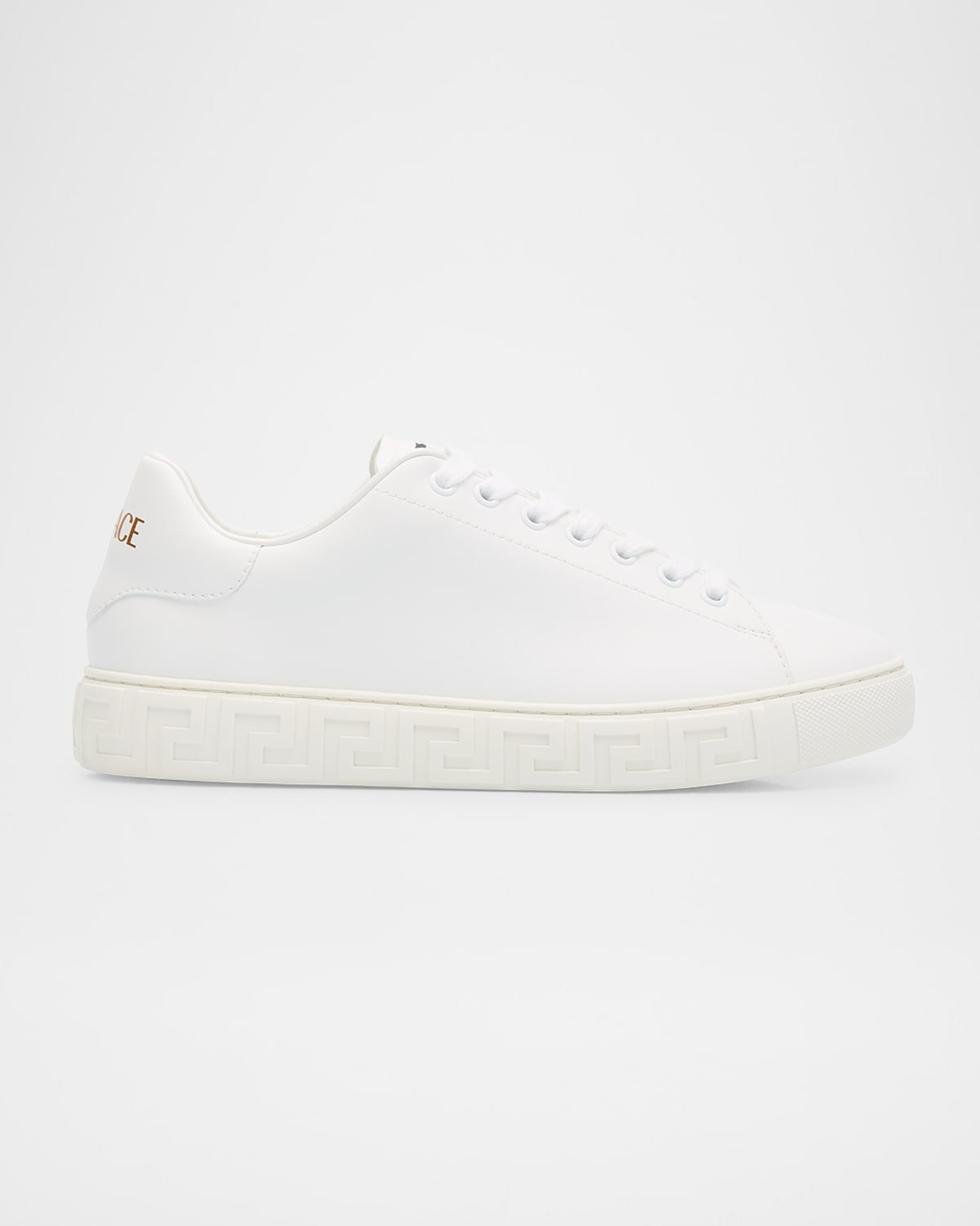 - Versace low-top sneakers in vegan faux leather (polyurethane) - 0.75 in / 20 mm flat heel - Greca-embossed midsole - Round toe - Lace-up vamp - Leather backstay with gold-tone logo - Cushioned footbed - Lining: Polyester - Lightweight, sturdy TPU outsole - Spot clean - Made in Italy