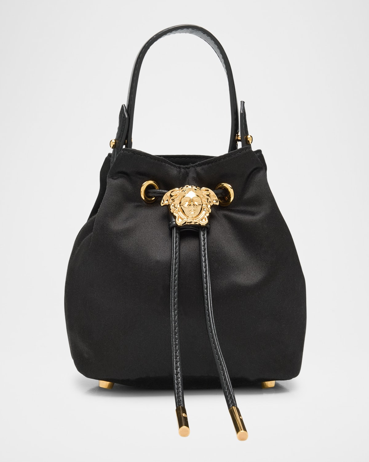 - Versace "La Medusa" satin silk bucket bag features signature Medusa head - Top handle - Drawstring closure - Feet protect bottom of bag - Approx. 5.9"H x 5.3"W x 3.9"D - Silk/viscose/leather - Made in Italy