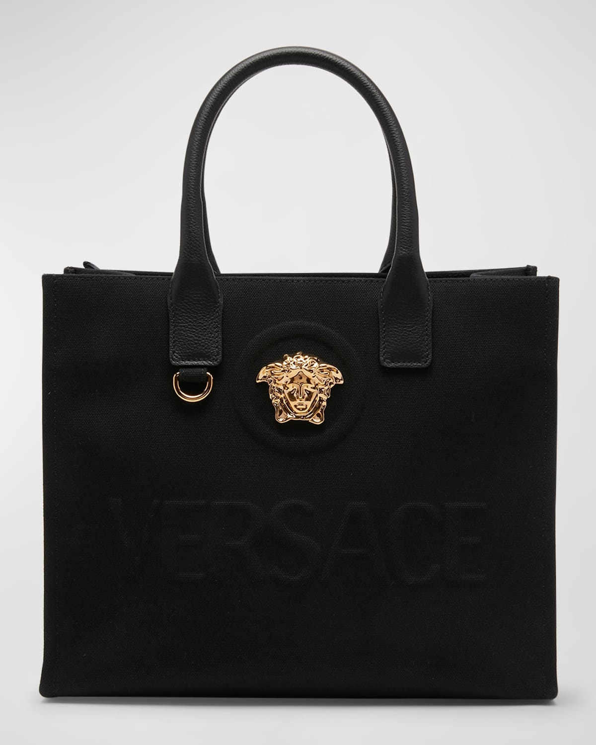- Versace "Le Medusa" cotton and calf leather tote bag with embossed logo across front - Features Medusa head medallion - Rolled top handles - Detachable, adjustable shoulder strap - Can be worn as a top handle or shoulder bag - Open top with snap closure - Interior, one zip pocket - Leather feet protect bottom of bag - Approx. 9.4"H x 11.6"W x 5.7"D - Made in Italy