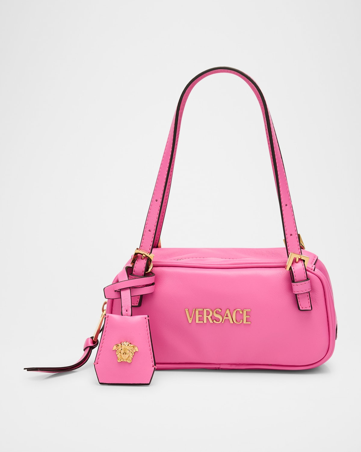 - Crafted in ultra-soft Nappa leather, the Versace "La Medusa" shoulder bag is slim and slightly structured, reminiscent of the classic bowling bag - Adjustable shoulder straps - Removable tag with signature Medusa hardware - Zip top closure - Metal logo lettering - Lining: Polyester - Approx. 3.3"H x 7.5"W x 3.3"D - Made in Italy