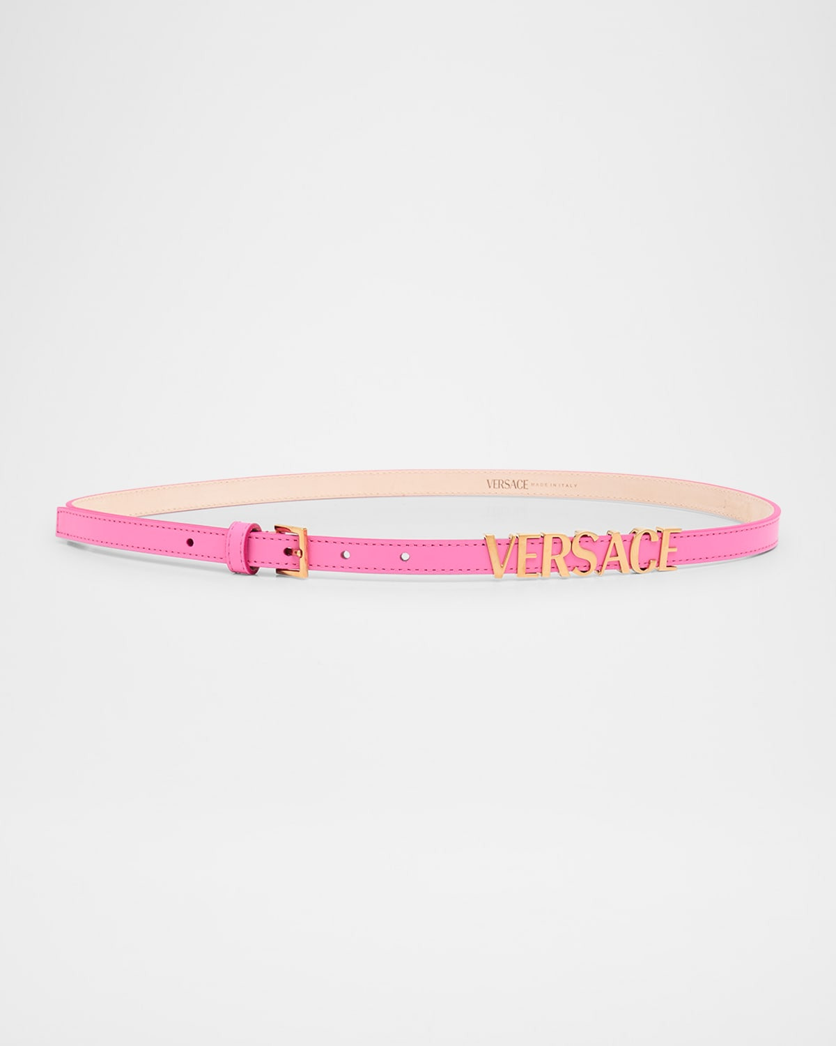 - Versace belt in calfskin leather - Approx. 0.6"H - Lettered logo hardware - Pin buckle closure - Made in Italy