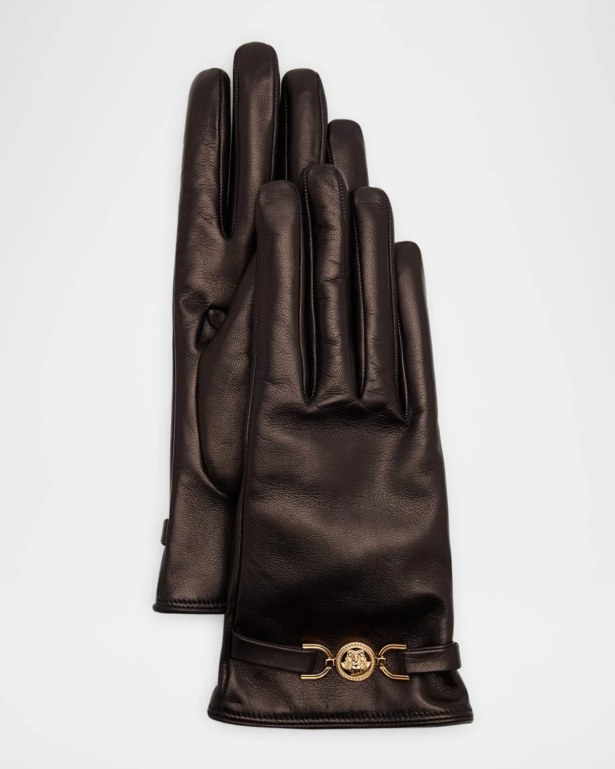 - Versace smooth grain leather gloves featuring a gold-tone Medusa plaque - Full-finger design - Strap detailing - Slip-on style - Leather/cashmere - Spot clean - Made in Italy - To determine your glove size, measure the circumference of your hand around your knuckles, excluding your thumb. Then pick your glove size based on the measurements below. For the most comfortable fit, you may want to go up a size if you fall in between these numbers. - S=6 to 6 1/2 inches - M=7 to 7 1/2 inches - L=8 to 8 1/2 inches