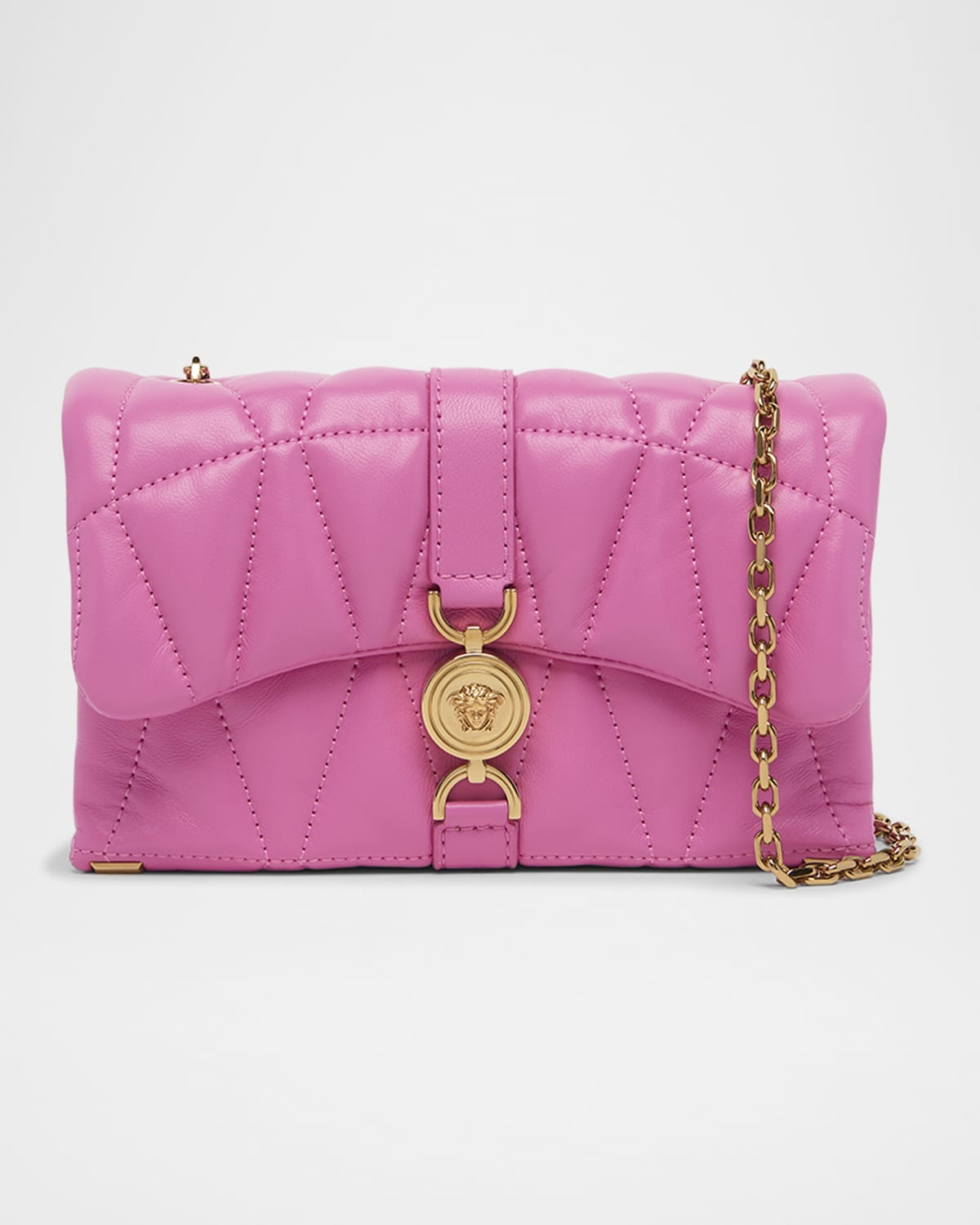 - Versace "Medusa 95" shoulder bag in quilted lamb leather - Sliding chain shoulder strap - Flap top with Medusa clasp closure - Divided interior; one slip pocket - Feet protect bottom of bag - Approx. 4.7"H x 7.5"W x 2.4"D - Made in Italy
