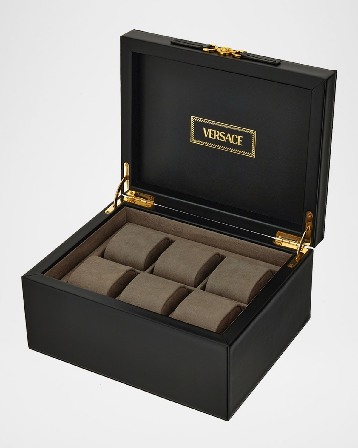 Accented by Medusa '95 hardware, an iconic House code that debuted in 1995, this leatherwrapped watch box is perfect for storing and protecting your watches. Crocodileembossed hinge lid Six watch compartments with removable pillows Lined with microfiber suede Approx. 9.4"L x 6.8"W x 7.4"T Leatherwrapped wood Spot clean Made in Italy