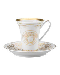 Cup and saucer made of ceramic/porcelain. Holds 3 ounces. Made in Germany.