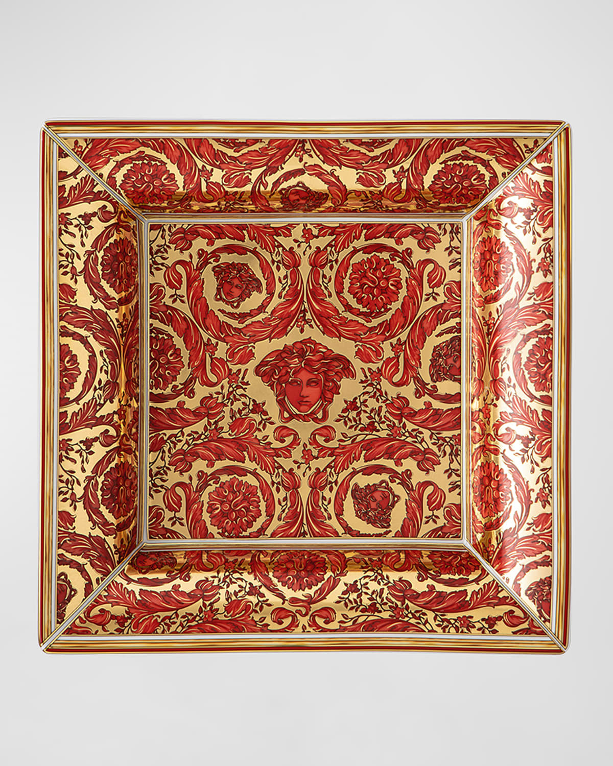 Lavish baroque plants and flowers play the central role in this pattern as an elaborate garland entwines the glorious Medusa, the iconic emblem of Versace Crafted of porcelain Approx. 7.3"Sq. Dishwasher safe Made in Germany