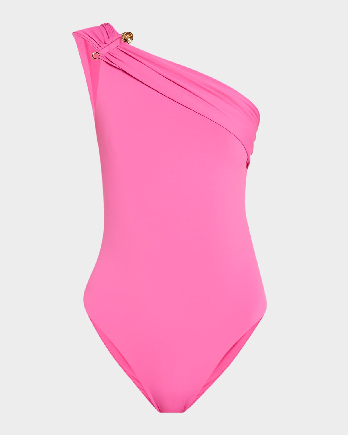 - Versace one-piece swimsuit adorned with a Medusa safety pin - One-shoulder neckline - Moderate seat coverage - Nylon/polyamide/elastane - Lining: Polyester/elastane - Hand wash - Made in Italy
