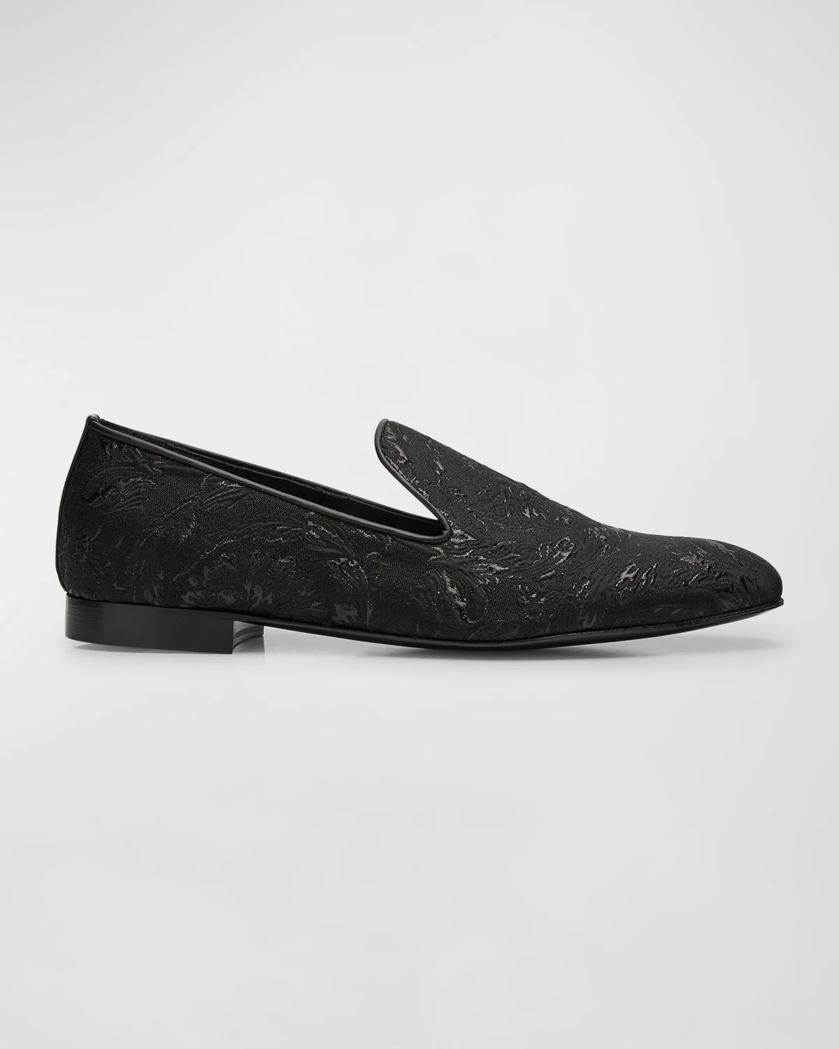 Versace smoking slippers in baroque jacquard fabric Stacked heel Round toe Notched vamp Leather trim, lining and sole Slipon style Made in Italy