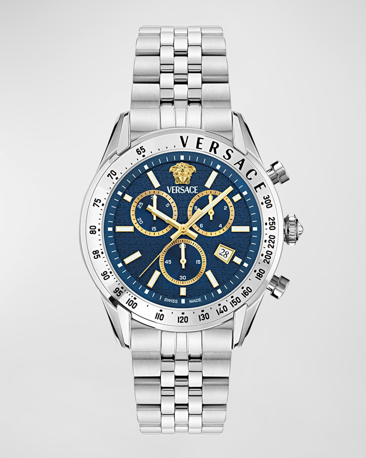 - Versace "Chrono Master" men's bracelet watch - 44mm; round stainless steel case - Logo accent on the bezel - Sapphire crystal glass - Blue guilloche logo dial - Three subdials - Logo and Medusa Head at 12 o'clock - Date window at 4 o'clock - Stainless steel five-link bracelet - Deployant buckle - Swiss Quartz movement - Water resistant at 5 ATM - Spot clean - Made in Italy