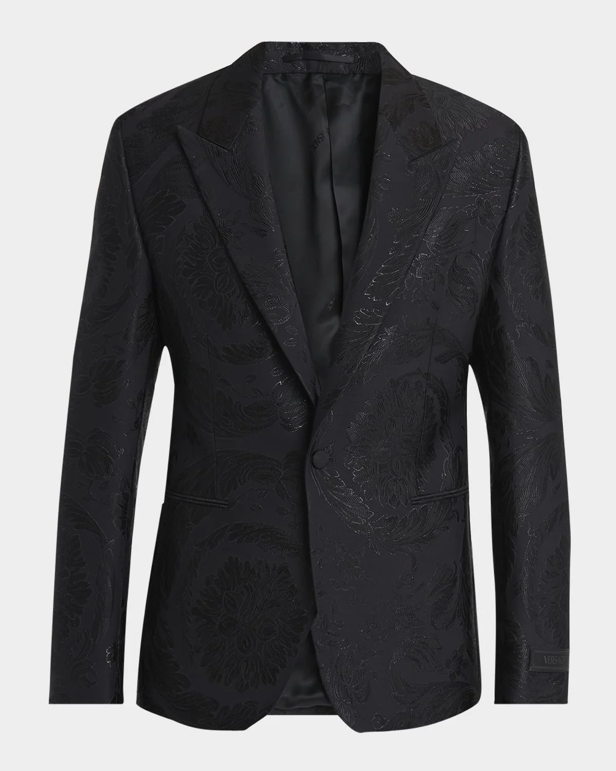 - Versace evening jacket in tonal Barocco jacquard - Peak lapels - Single-button closure - Chest welt pocket - Jetted hip pockets - Single-button cuffs - Center back vent - Viscose/virgin wool/nylon/polyamide - Lining: Cotton/cupro - Dry clean - Made in Italy