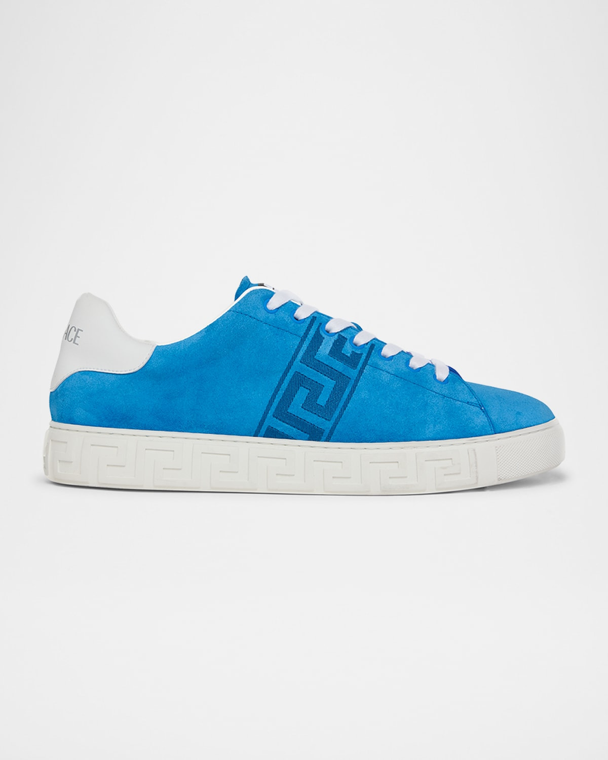 - Versace "La Greca" low-top sneakers in suede featuring tonal Greek Key accents on the midsole and sides - Flat heel - Round toe - Lace-up vamp - Woven label on the tongue - Padded collar - Backstay logo - Polyester lining - Rubber outsole - Made in Italy
