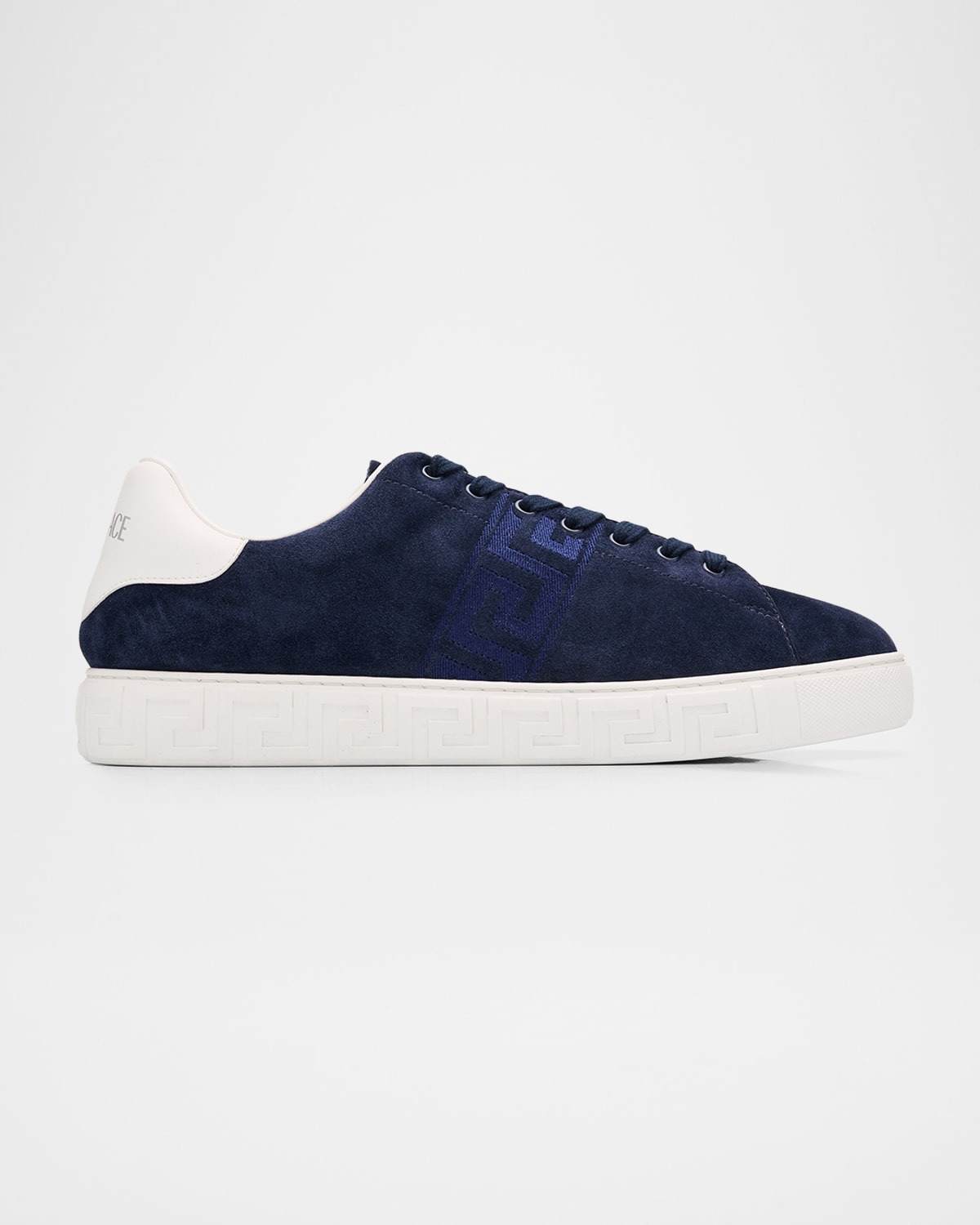 - Versace "La Greca" low-top sneakers in suede featuring tonal Greek Key accents on the midsole and sides - Flat heel - Round toe - Lace-up vamp - Woven label on the tongue - Padded collar - Backstay logo - Polyester lining - Rubber outsole - Made in Italy