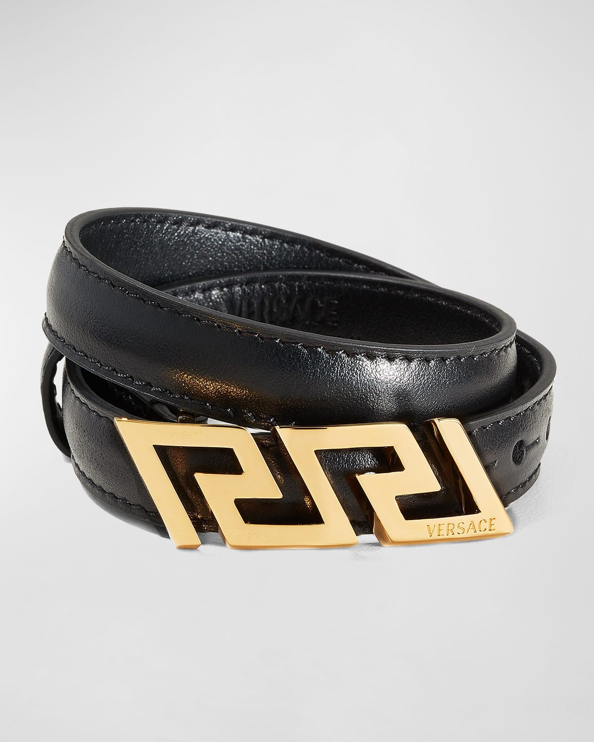 - Versace wrap bracelet featuring iconic gold-tone La Greca metal buckle hardware with engraved logo accent - Adjustable fit - Push-pin fastening - Leather/metal - Made in Italy