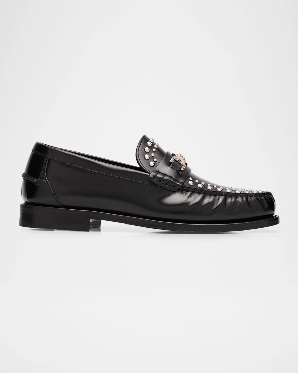 Versace polished calf leather loafers featuring Medusa '95 hardware on the penny strap and stud embellishments on the uppers. Flat stacked heel Round toe Horsebit vamp Slipon style Leather sole Made in Italy