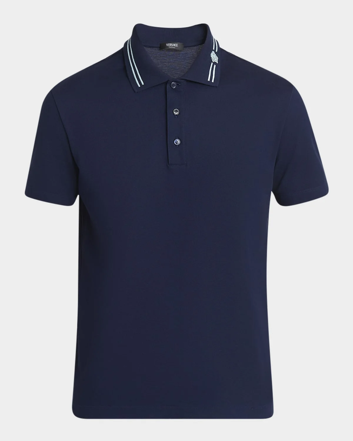 - Versace polo shirt in solid pique - Signature Medusa embroidered collar - Three-button placket - Short sleeves - Pullover style - Cotton - Dry clean - Imported - Model is 6'1"/185cm.