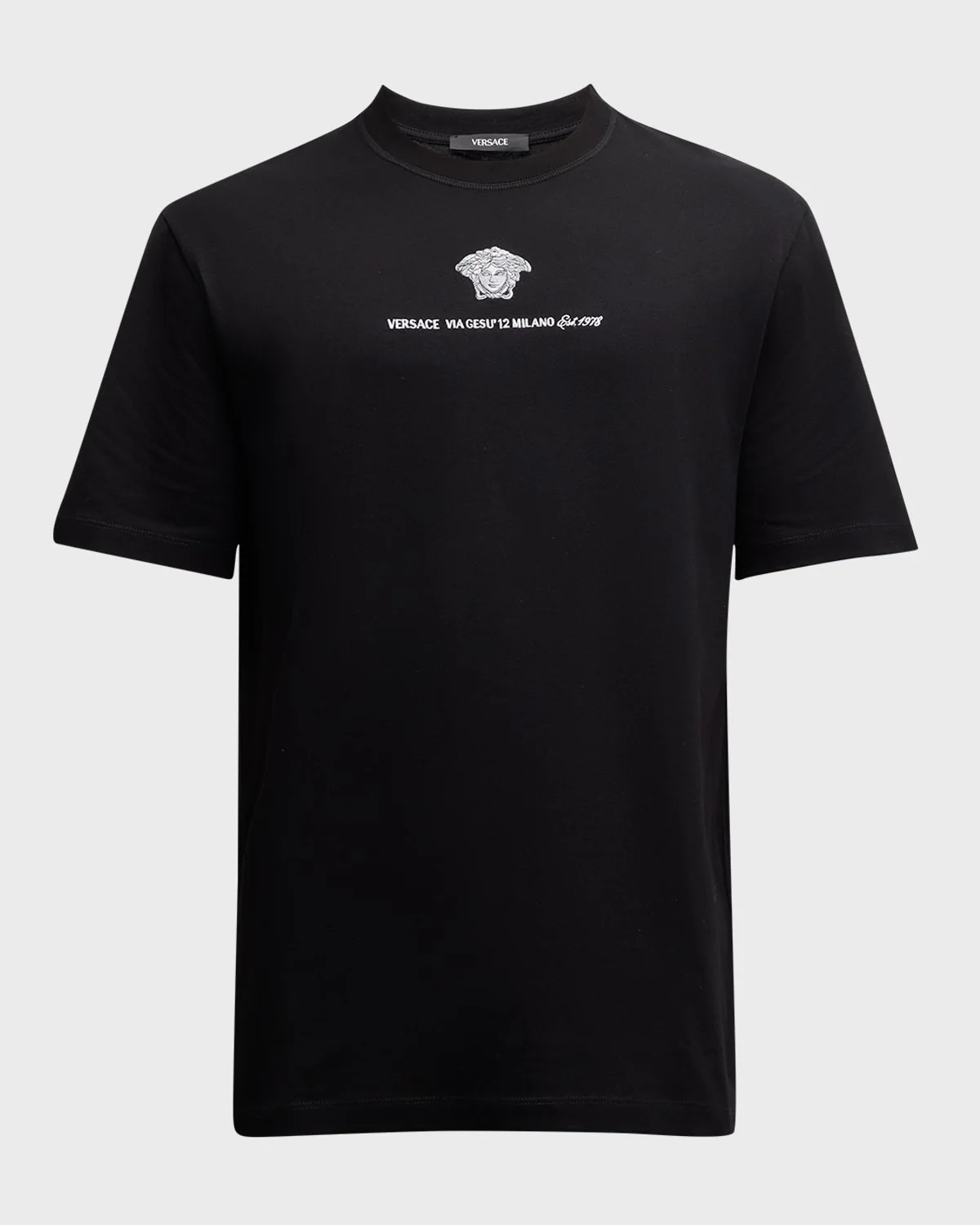 - Versace T-shirt with Medusa embroidery at chest - Crew neckline - Short sleeves - Pullover style - Cotton - Imported - Model is 6'1"/185cm.