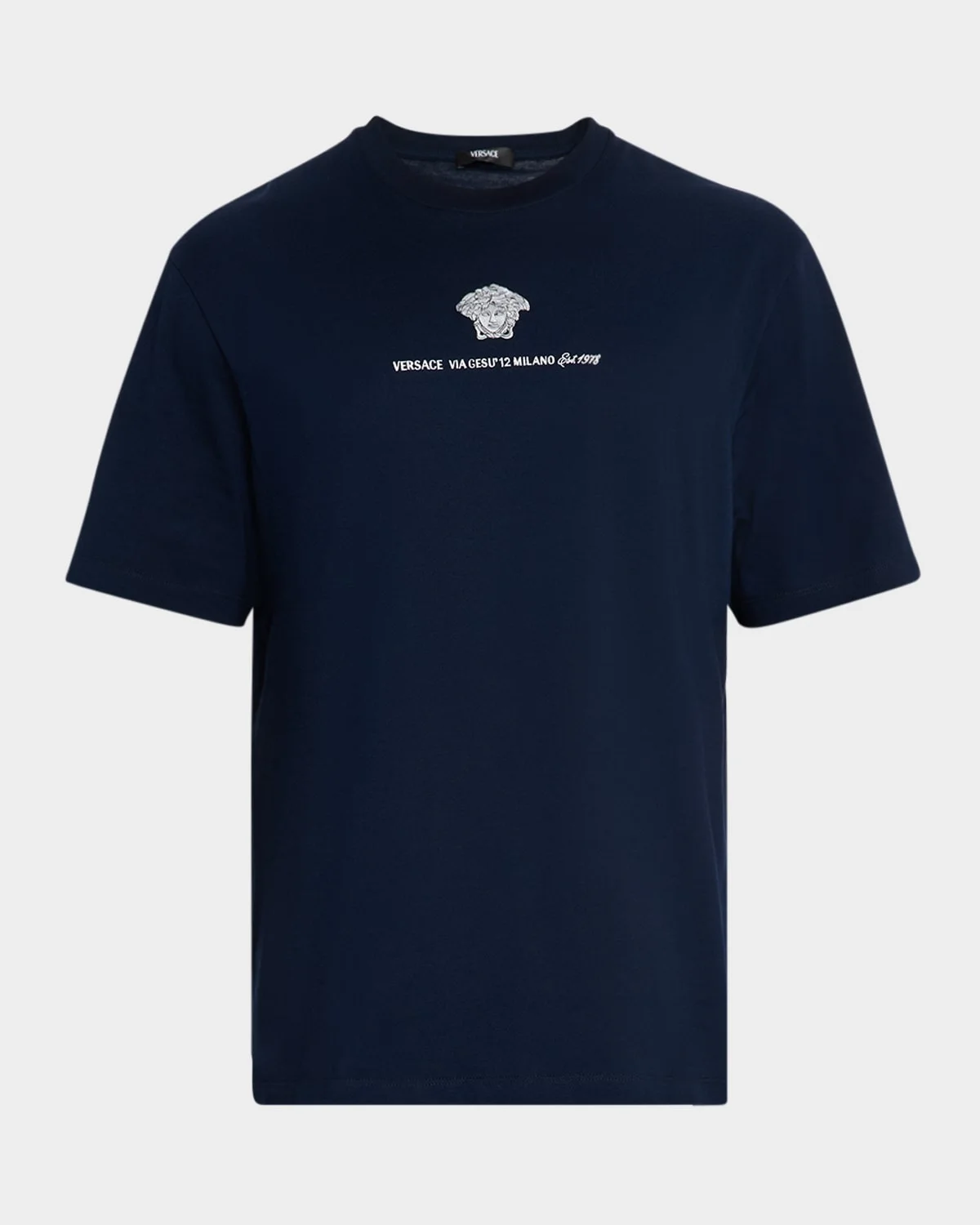 - Versace T-shirt with Medusa embroidery at chest - Crew neckline - Short sleeves - Pullover style - Cotton - Imported - Model is 6'1"/185cm.