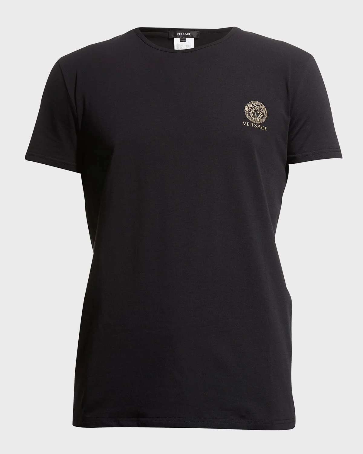 - Versace jersey T-shirt with Medusa head logo medallion. - Crew neckline. - Short sleeves. - Pullover style. - Slim fit. - Cotton/spandex. - Made in Italy.