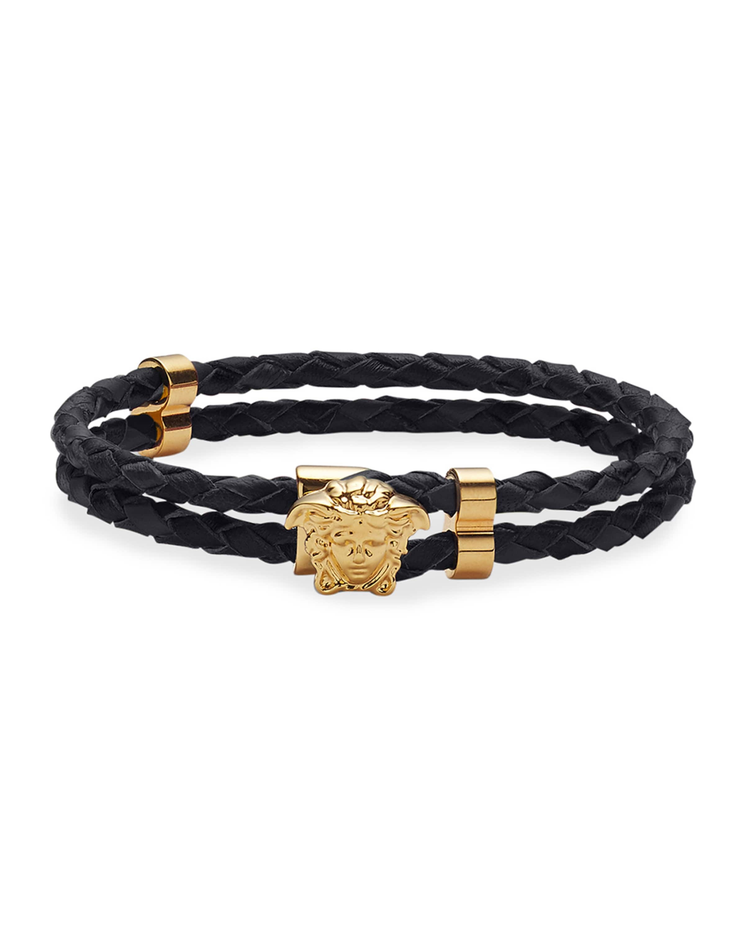 - Versace two-row braided leather bracelet. - Features signature Medusa head. - Golden brass hardware. - Made in Italy. Online Inquiries: NMS21_N6DTA Store Inquiries: #3164699