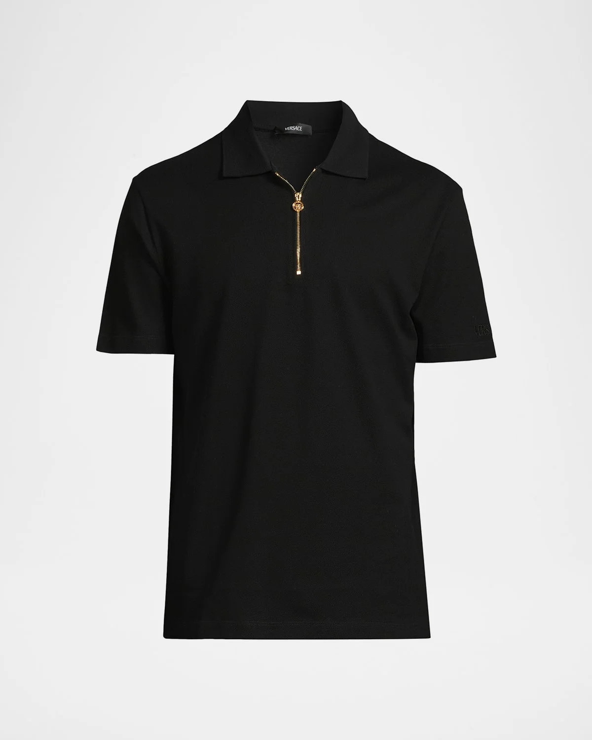 Versace polo shirt in soid pique Classic collar Quarterzip placket Signature Medusa zipper pull Short sleeves Regular fit Cotton Dry clean Imported