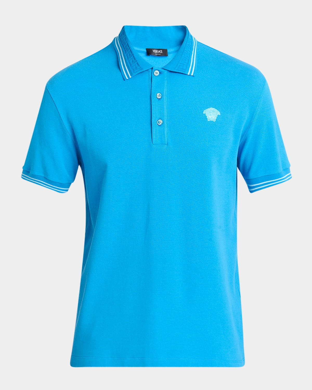 - Versace polo shirt with tipped collar and cuffs - Iconic Greca patterned collar - Three-button placket - Embroidered Medusa logo at chest - Cuffed short sleeves - Pullover style - Cotton - Machine wash - Imported - Model is 6'1"/185cm.