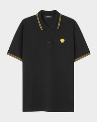 - Versace polo shirt with tipped collar and cuffs - Iconic Greca patterned collar - Three-button placket - Embroidered Medusa logo at chest - Cuffed short sleeves - Pullover style - Cotton - Machine wash - Imported - Model is 6'1"/185cm.