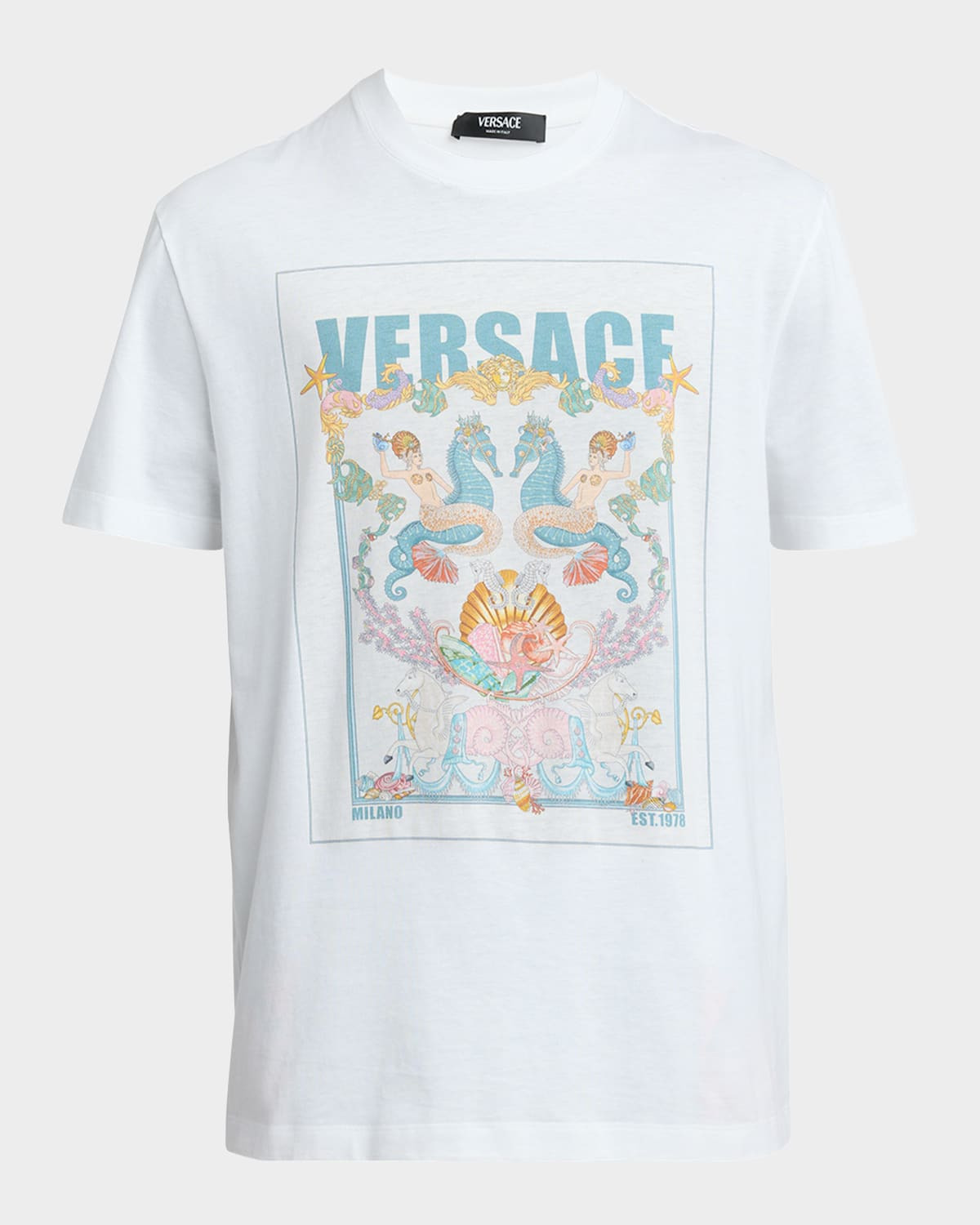 - Versace T-shirt showcasing a postcard graphic print on the front - Crew neckline - Short sleeves - Pullover style - Cotton - Hand wash or dry clean - Made in Italy