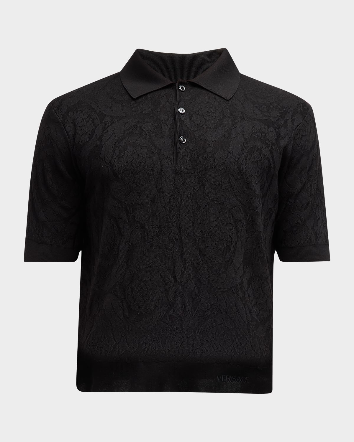 - Versace knit polo shirt in a lightweight blend of cotton and silk - Features an allover tonal Barocco pattern - Spread collar - Three-button placket - Short sleeves - Ribbed cuffs and hem - Hem with embroidered logo - Pullover style - Silk/cotton - Machine wash - Made in Italy