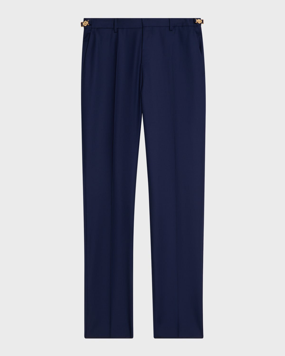 - Versace formal pants in pure wool - Features Medusa hardware - Regular rise - Back elastic waistband - Side slit pockets; back welt pockets - Straight fit - Button/zip fly; belt loops - Virgin wool - Lining: Cotton/cupro - Dry clean - Made in Italy