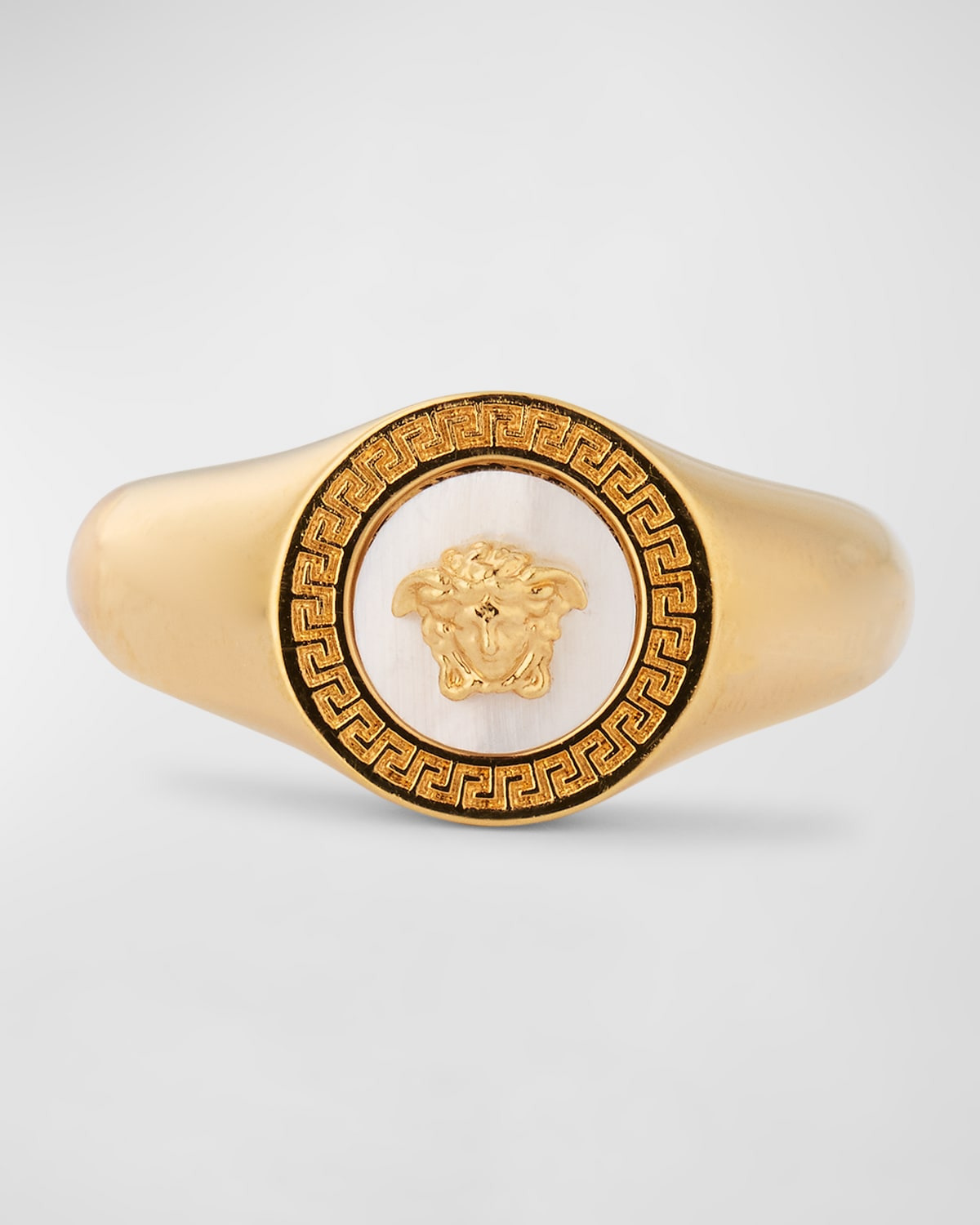- Versace ring - Gold-toned brass - Mother-of-pearl inlay - Signature Medusa motif and Greca engraving - Made in Italy