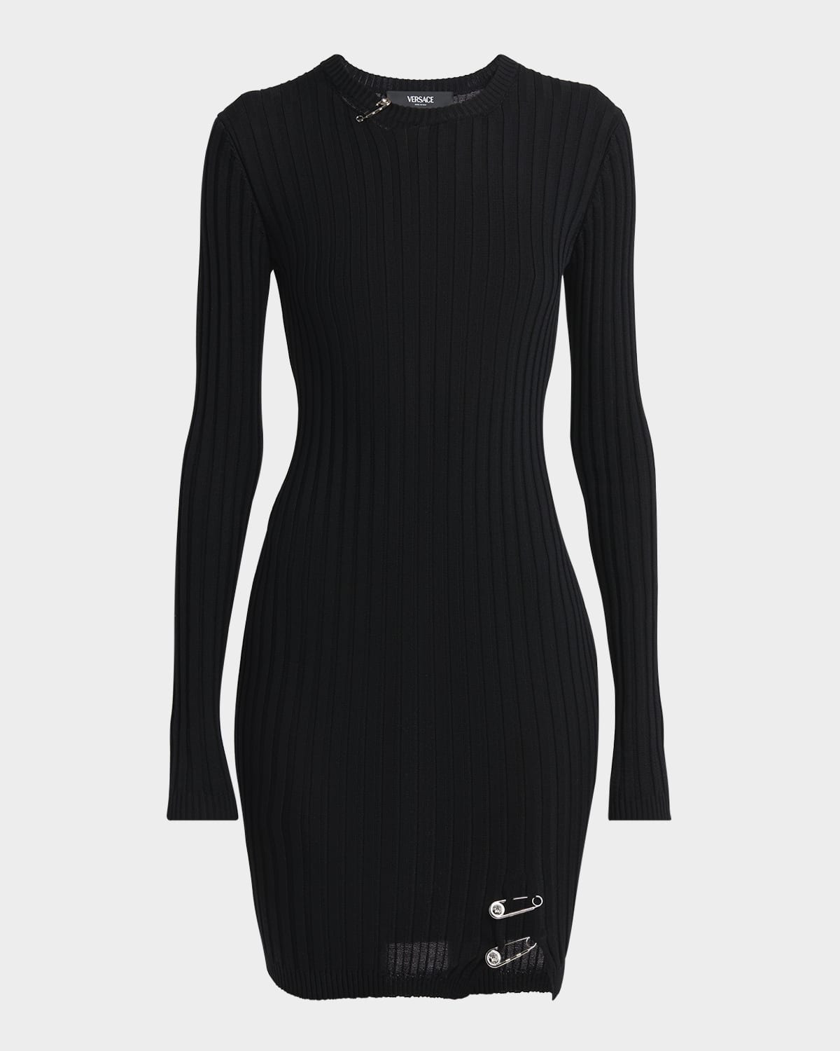 Versace vanise knit dress featuring signature silvertone safety pin neck slash cutout and slit hem Round neckline Long sleeves Sheath silhouette Midthigh length Slipover style Viscose/virgin wool Professional cleaning recommended Made in Italy