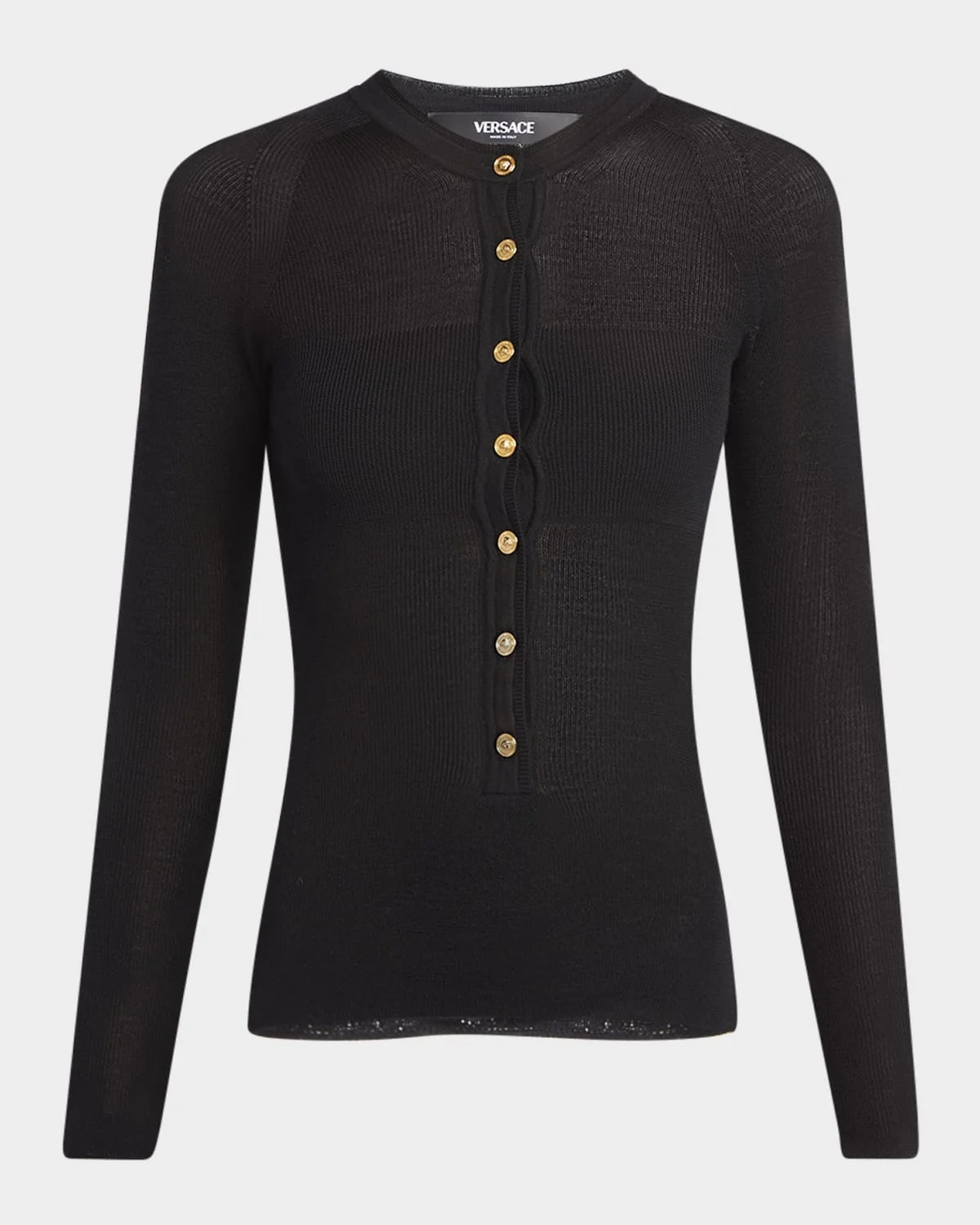 - Versace seamless ribbed knit henley sweater with signature goldtone Medusa buttons - Crew neckline; seven-button front - Long raglan sleeves - Fitted - Pullover style - Virgin wool/nylon/polyamide/elastane - Dry clean - Made in Italy