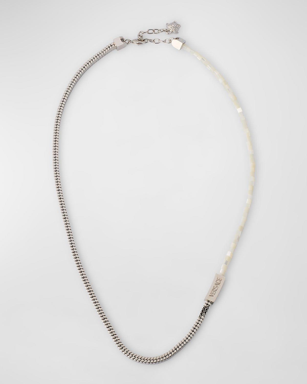 - Versace necklace - Silvertone brass - Mother-of-pearl beads - Logo-engraved band and signature Medusa stud - Adjustable length - Lobster clasp - Made in Italy