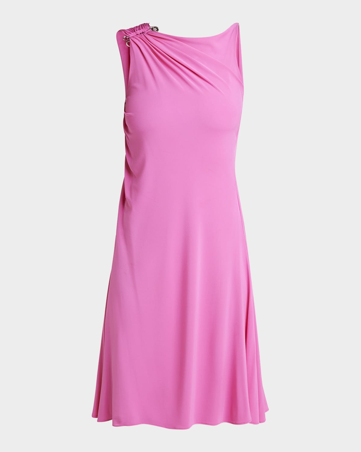 - Versace dress in stretch crepe jersey features a shoulder drape gathered into a Medusa safety pin - High neckline - Sleeveless - Hem falls above the knee - A-line silhouette - Slipover style - Viscose/elastane - Lining: Elastane/viscose - Dry clean - Made in Italy