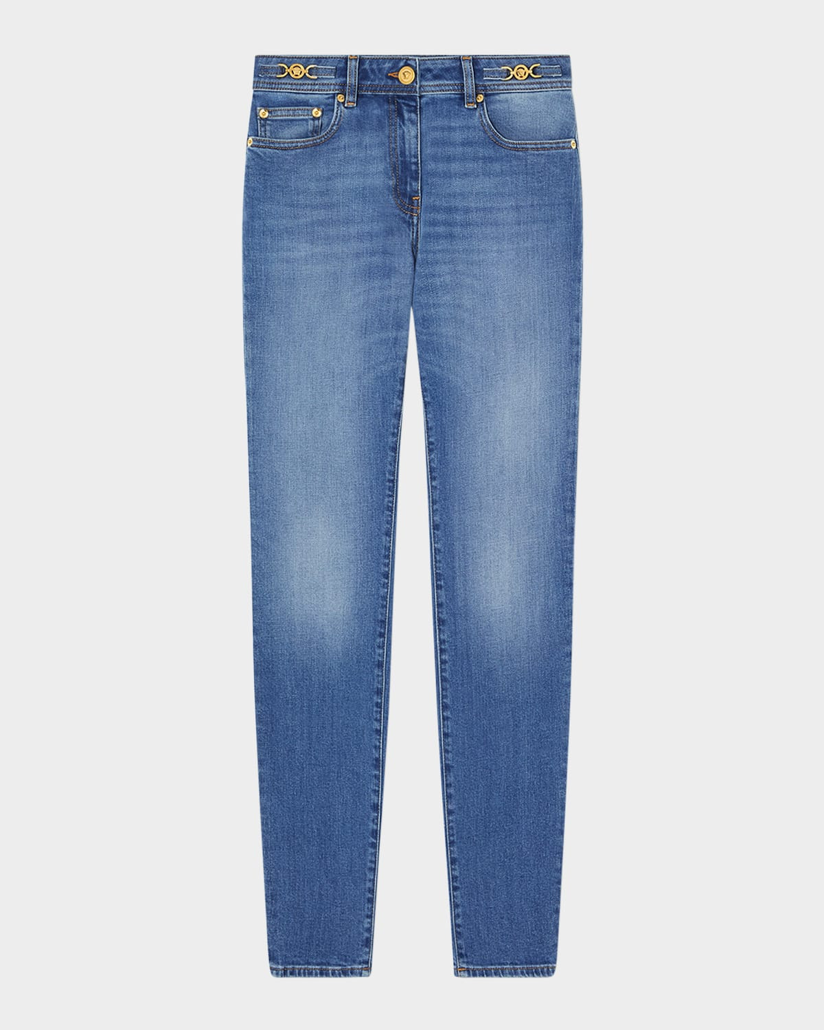 - Versace pants in stretch denim stone washed with a special compound - Features goldtone signature Medusa hip details - Mid rise sits high on hip - Five-pocket style - Skinny legs - Full length - Button/zip fly; belt loops - Cotton/elastane/leather - Dry clean - Made in Italy