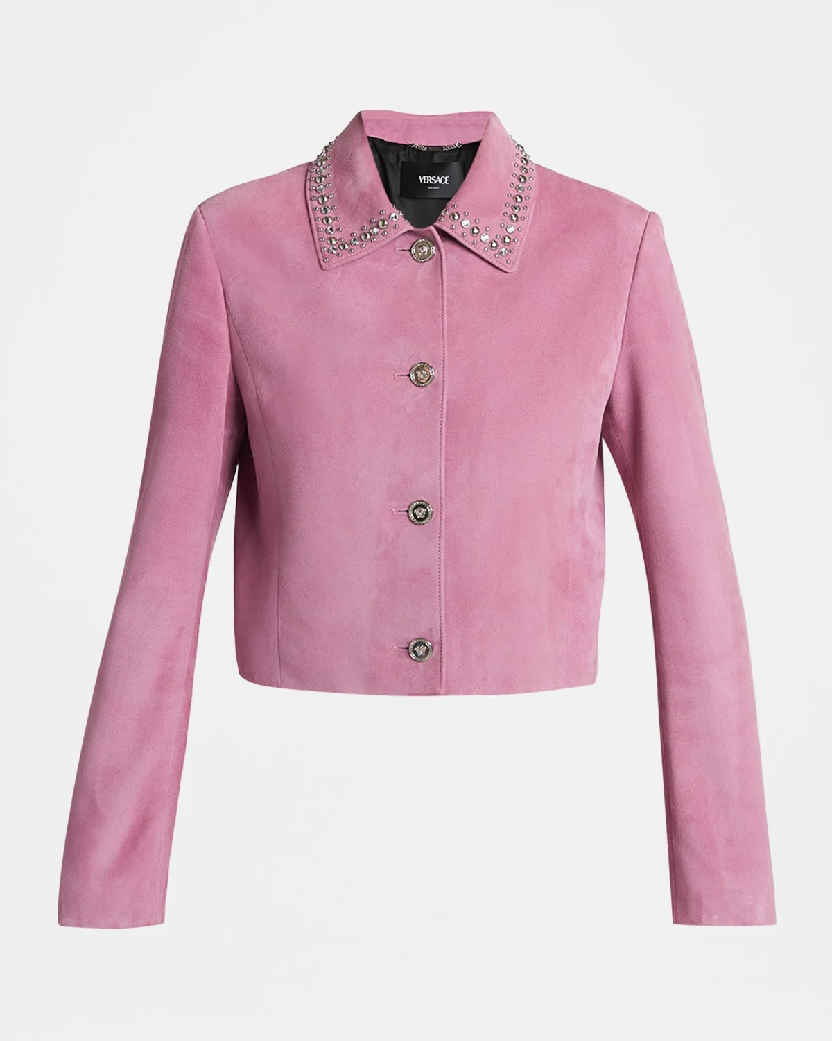 Crafted from supple lambskin suede, this Versace jacket boasts a tailored silhouette elevated with a studded collar for a bold finish. Spread collar Long sleeves Classic fit Hem sits at the hip Buttonfront Leather Professional cleaning recommended Made in Italy