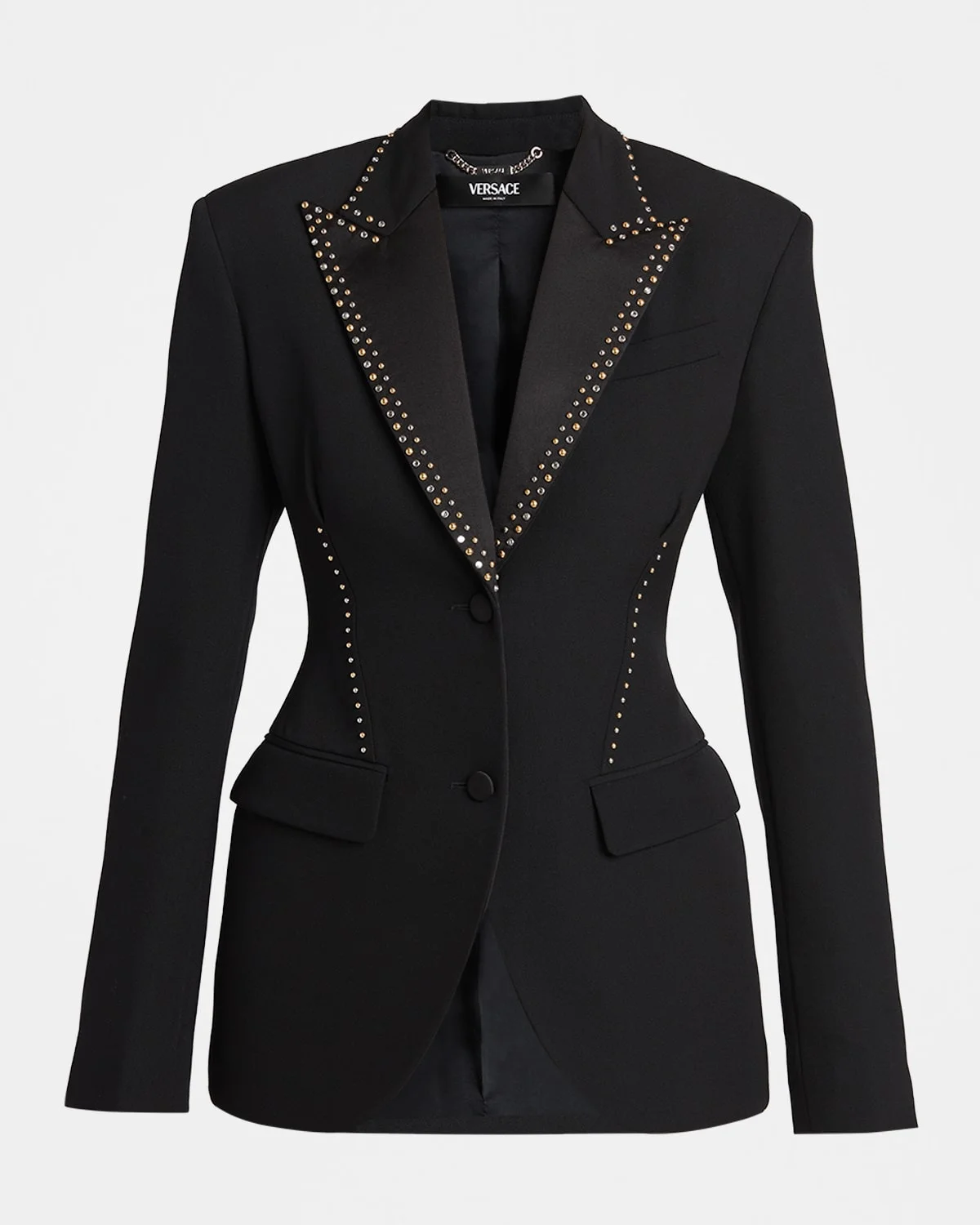 Tailored in a structured wool-blend, this Versace jacket is decorated with studded trim and features a defined waist creates an effortless, hourglass silhouette. Wide peak lapels & nbsp; Single-breasted front & nbsp; Structured shoulders Long sleeves with button cuffs Chest welt pocket & nbsp; Hip flap pockets Tailored silhouette Cut-away hem & nbsp; Button-front & nbsp; Virgin wool/silk/polyester Dry clean only & nbsp; Made in Italy