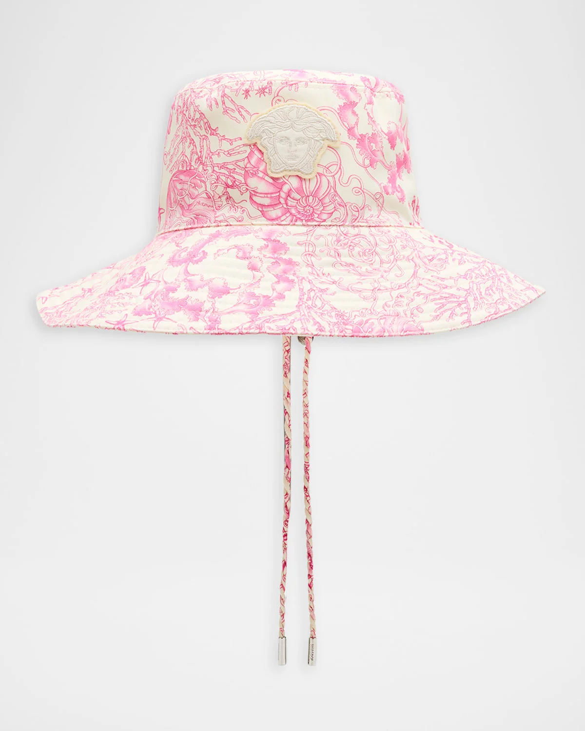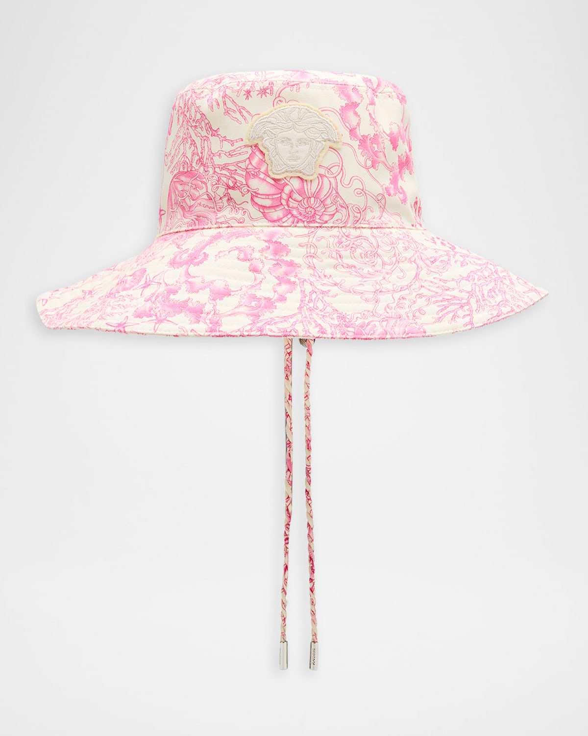 - Versace drill cotton bucket hat featuring an underwater baroque print with a signature Medusa embroidered patch on the front - Flat crown - Downturned brim - Drawcord neck ties - Cotton/polyester - Spot clean - Made in Italy