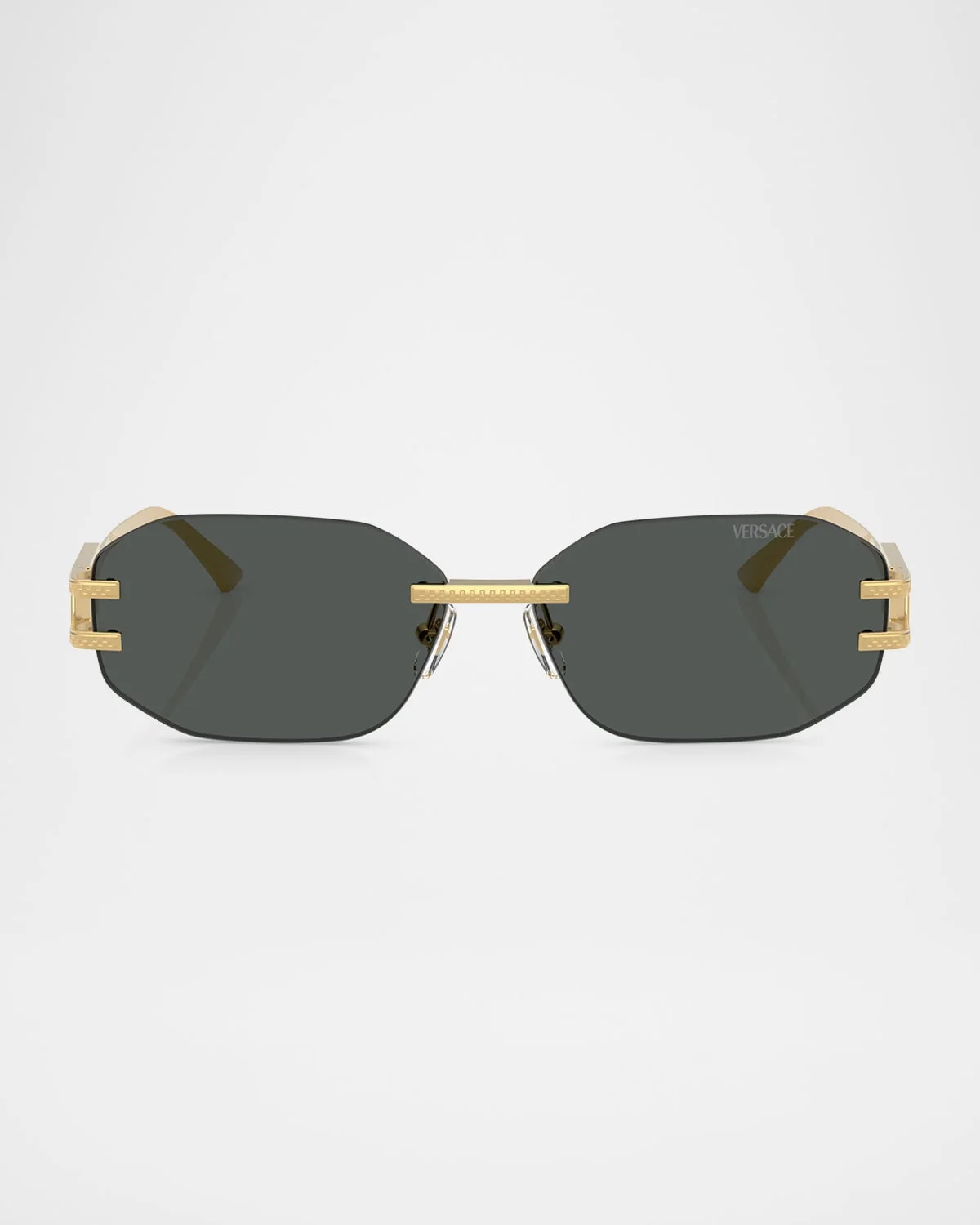 - Versace "VE2274" oval sunglasses in metal and plastic - From the Damier Plaque collection - Eye/bridge/temple (in mm): 58-13-140 - Solid lenses - Adjustable nose pads - Thin, tapered arms - Capped ear pieces - Logo at temples - Comes with case and cloth - Metal/plastic - Spot clean - 100% UVA/UVB protection - Made in Italy - Proposition 65 warning for California residents