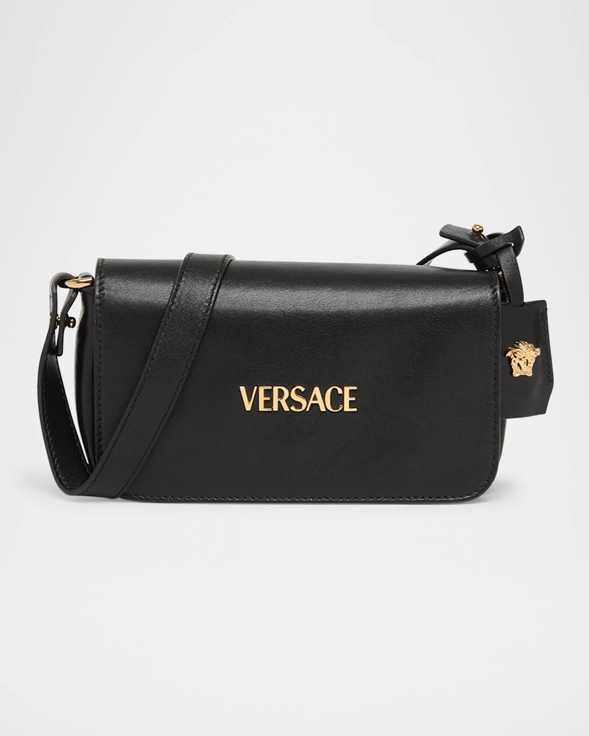 - Versace "Versace Tag" shoulder bag in lamb leather - Adjustable shoulder strap with keyring tag - Flap top with magnetic closure - Interior, one slip pocket, one card slot, and one zip pocket - Approx. 4.7"H x 7.5"W x 1.4"D - Made in Romania