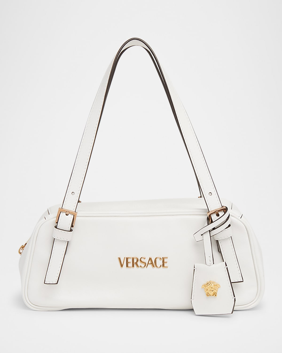 - Versace "Versace Tag" shoulder bag in lamb leather - Adjustable buckle shoulder straps with keyring tag - Zip top closure - Interior, one card slot - Feet protect bottom of bag - Approx. 4"H x 10.7"W x 4.7"D - Made in Italy