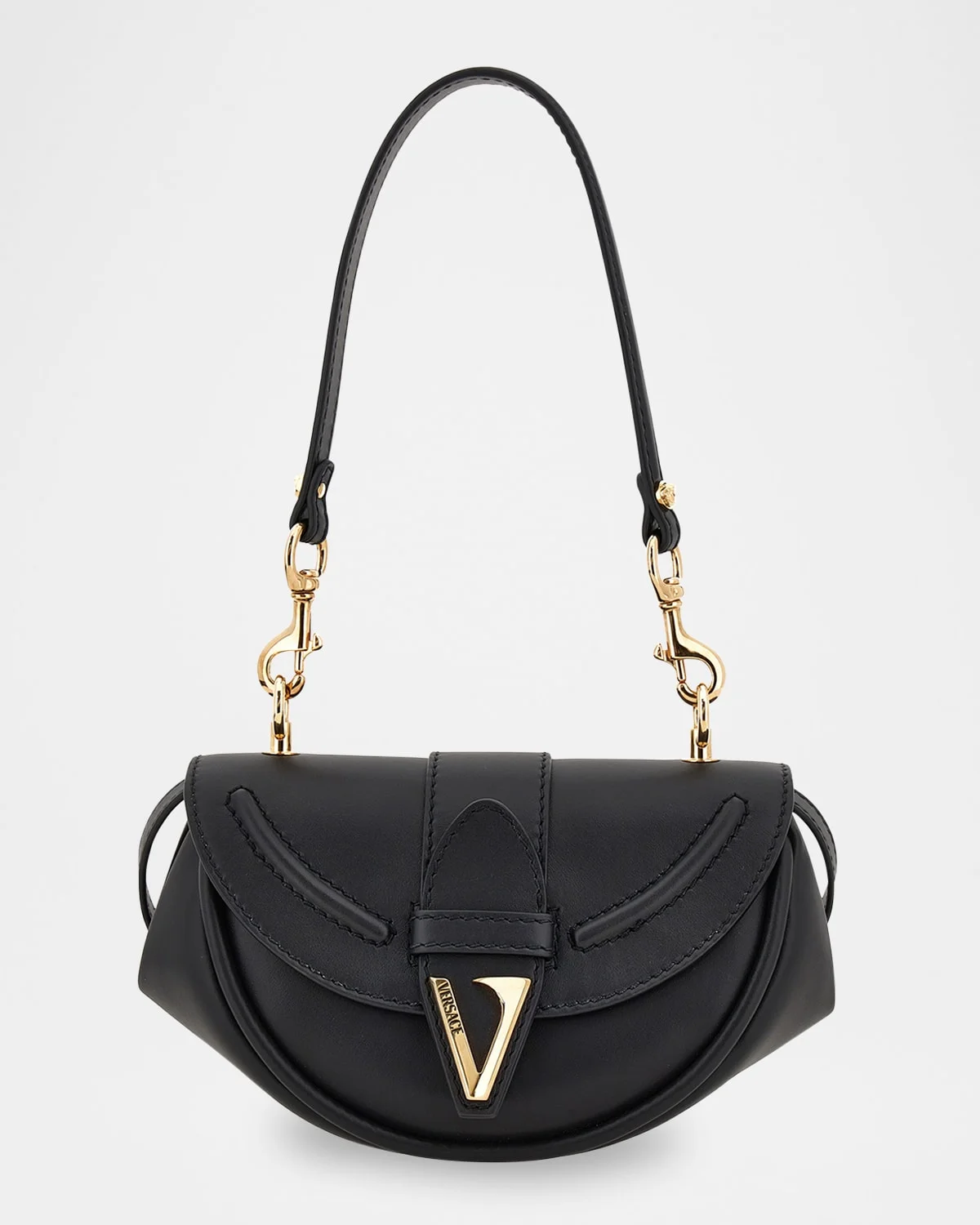 - Versace "Virtus" small semi-circular shoulder bag in supple calf leather, brightened with an engraved V emblem - Detachable shoulder strap - Detachable, adjustable crossbody strap - Can be worn as a shoulder or crossbody bag - Flap top with magnetic closure - Interior, one slip pocket - Lining: Cotton - Approx. 5.9"H x 10.4"W x 4.9"D - Made in Italy