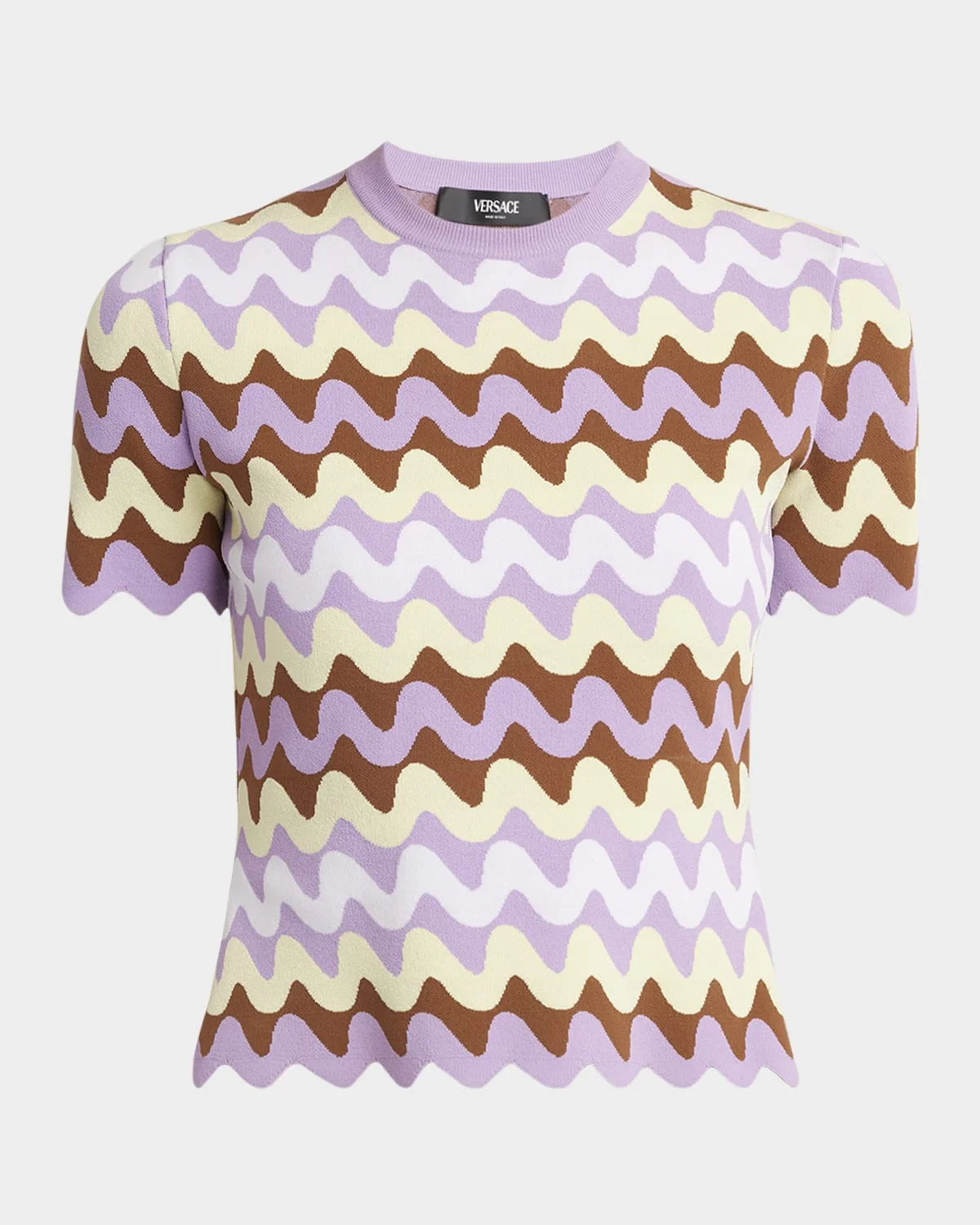 - Versace compact stretch viscose knit sweater with a wavy intarsia and scalloped edges - Crew neckline - Short sleeves - Slim fit - Pullover style - Viscose/nylon/polyamide/polyester - Dry clean - Made in Italy