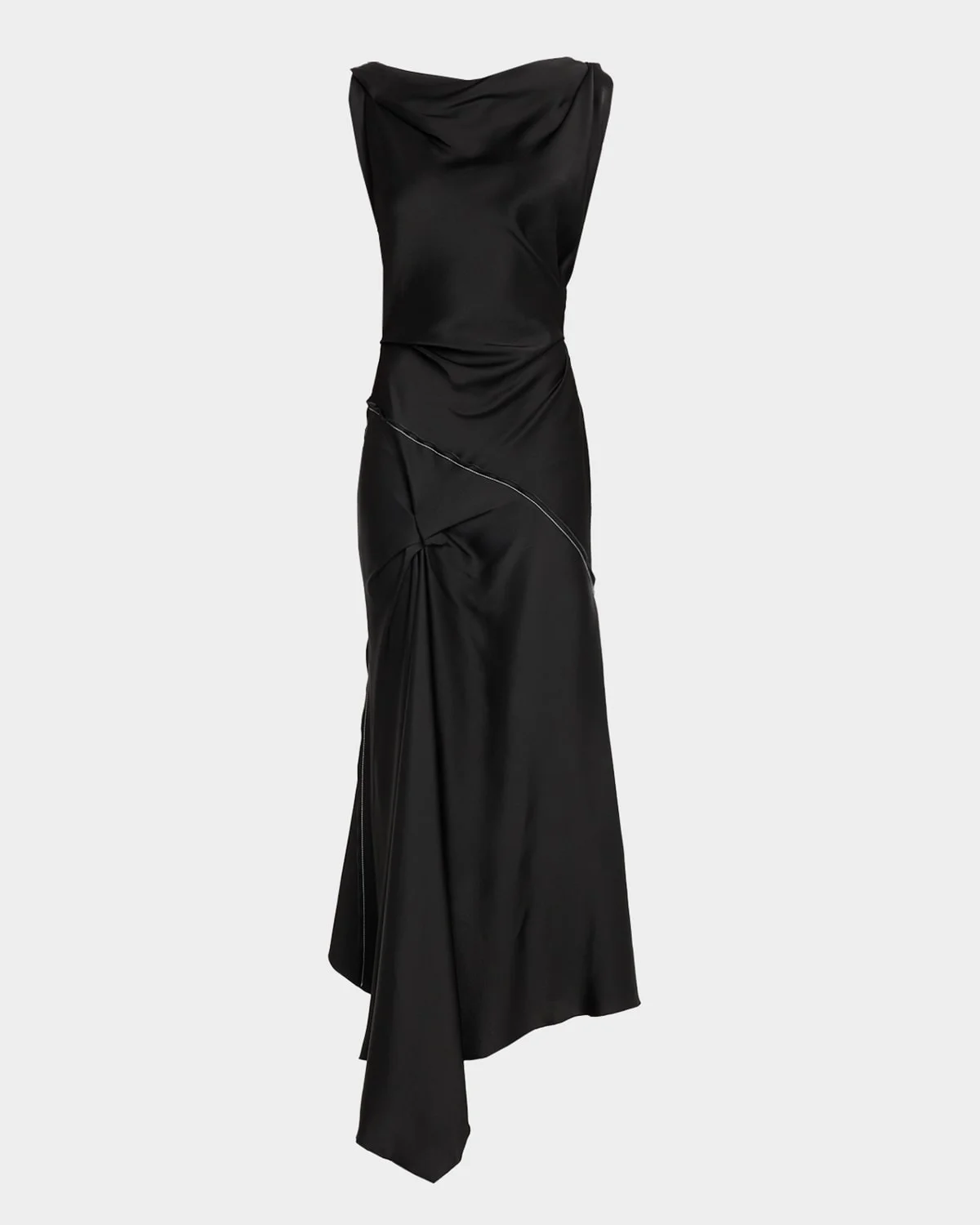 Asymmetric Draped Sleeveless Satin Midi Dress