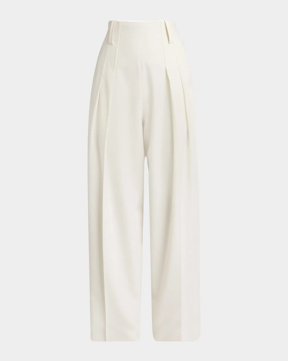 - Victoria Beckham cinched wool-blend trousers finished with front pleating - High waist - Side seam and back welt pockets - Full length - Wide legs - Oversized belt loops - Wool/polyester - Dry clean - Made in Portugal