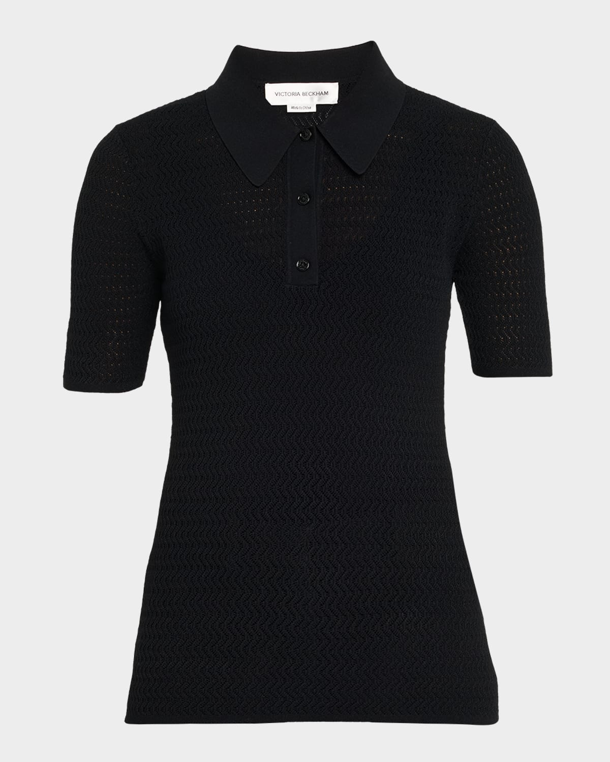 - Victoria Beckham polo top in a pointelle chevron knit - Spread collar; three-button placket - Short sleeves - Slim fit - Pullover style - Viscose/nylon/polyamide - Dry clean - Imported