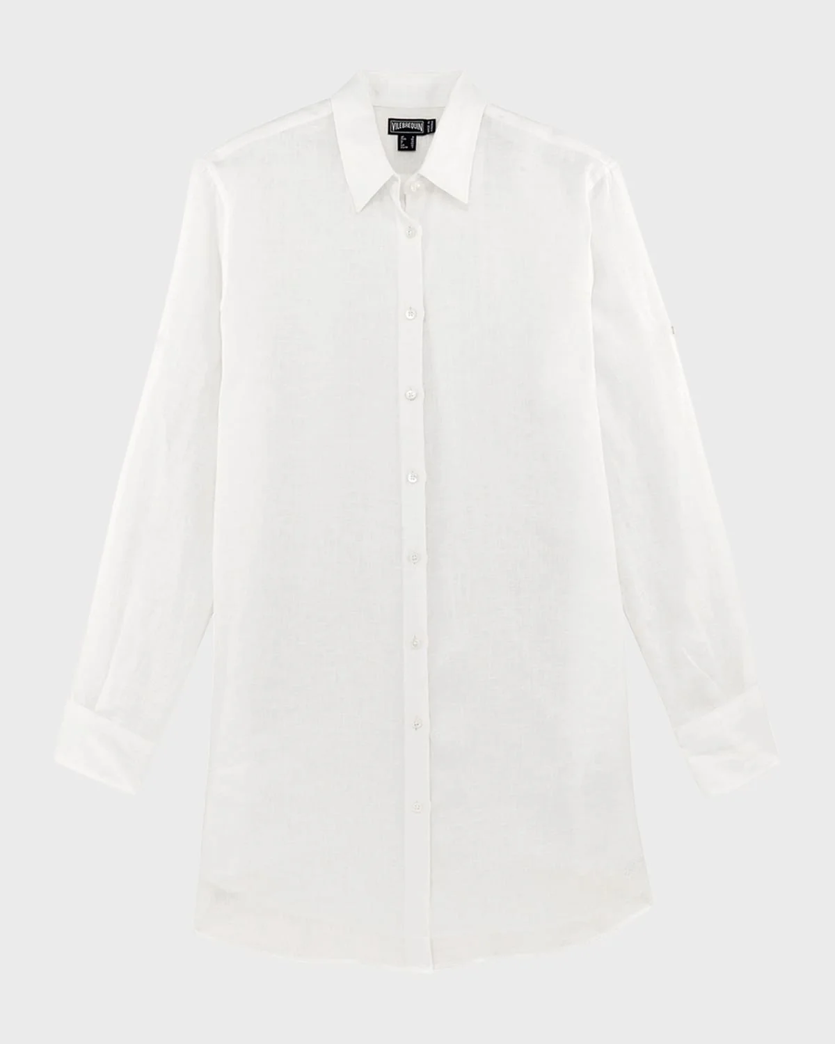 Vilebrequin shirtdress crafted from a lightweight fabrication Spread collar; button front Long sleeves; button cuffs Yoked back Hem falls above the knee Linen Hand wash, machine wash cold, line dry Made in Romania