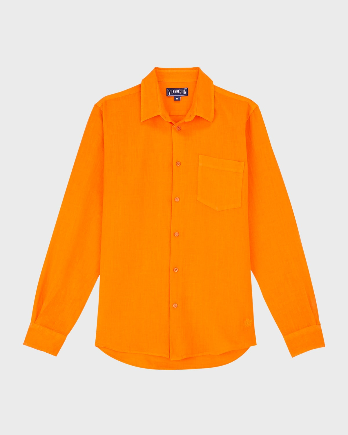 - Vilebrequin "Caroubis" sport shirt in soft linen. - Spread collar; button front. - Chest patch pocket. - Barrel cuffs. - Regular fit. - Side pleats at back yoke. - Tonal turtle embroidery at hem. - Imported.