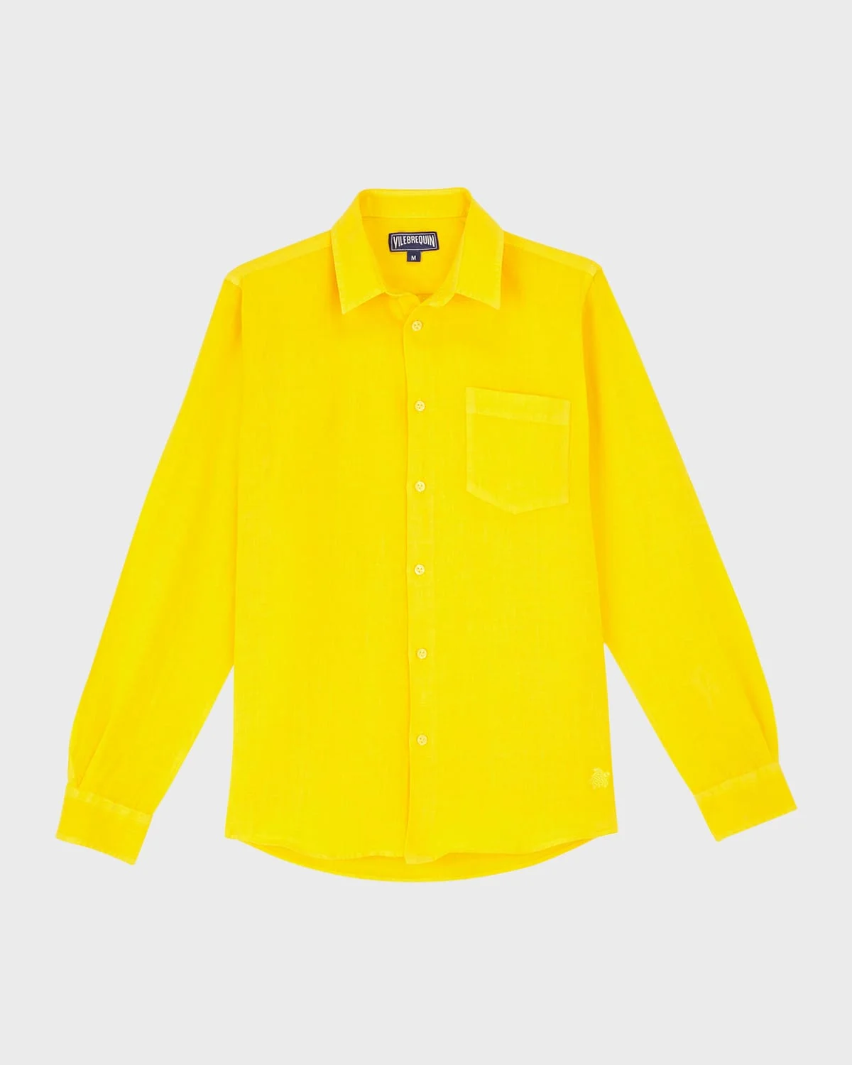 Vilebrequin "Caroubis" sport shirt in soft linen. Spread collar; button front. Chest patch pocket. Barrel cuffs. Regular fit. Side pleats at back yoke. Tonal turtle embroidery at hem. Imported.