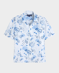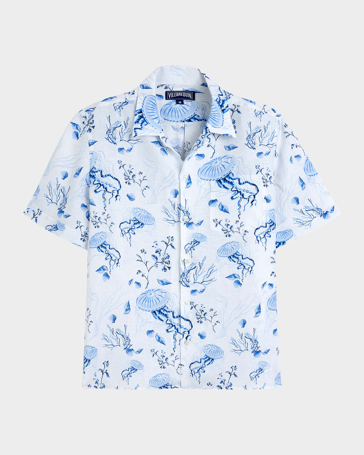 - Vilebrequin bowling shirt in lightweight linen highlighted with an allover jellyfish shell print - Approx. 27"L from shoulder to hem - Notch collar - Chest pocket - Button placket - Short sleeves - Pleated back yoke - Vented sides - Straight hem - Classic fit - Linen - Hand wash, machine wash cold, line dry - Made in Morocco